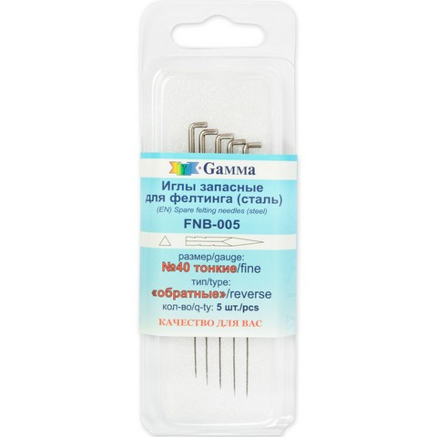 В блистере 5 сменных игл для фелтинга c треугольным сечением, с обратным направлением зубьев. Иглы очень острые, поэтому рекомендуем работать не спеша, на подложке арт.FN-003, FN-004. Рекомендуем приобретать запасные иглы FNB-005 №36 и №40 подходят к наборам арт. FN006 /игла с разборной деревянной ручкой/ и FN007 /набор для валяния 7 иглами/. При прокалывании изделия необходимо держать иглу вертикально, т.е. перпендикулярно поверхности. Боковые проколы могут сократить срок службы иглы. Игла с обратным направлением зубьев, легко входит, с усилием выходит из изделия. Позволяет доваливать изделия с обратной стороны, проткнув его насквозь /для мест с неудобным доступом/. Также позволяет "начесывать" шерсть или перемешивать глубоко лежащие волокна с поверхностными волокнами, разных цветов. Игла используется для окончательной /отделочной/ обработки шерсти и для создания ворса на готовом сваленном изделии. Иглы обработаны маслом, оно защищает иглу от ржавчины. Перед работой иглу необходимо протереть сухой тряпочкой и можно работать.